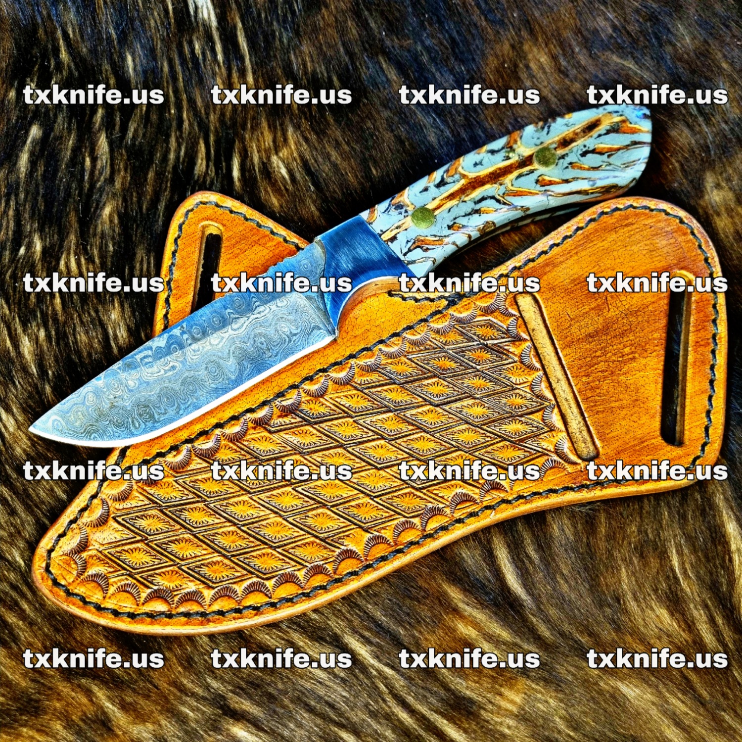 custom made raindrop pattern damascus steel western cowboy knife.